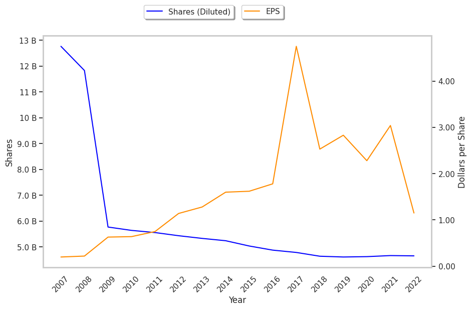 To determine Comcast's EPS growth over time, we will average out its EPS for 2007, 2008, and 2009, which were $0.83, $0.86, and $0.33 respectively. This gives us an average of $0.67 for the period of 2007 to 2009. Next, we compare this value with the average EPS reported in 2020, 2021, and 2022, which were $2.28, $3.04, and $1.21, for an average of $2.18. Now we see that Comcast's EPS growth was 225.37% during this period, which satisfies Ben Graham's requirement.