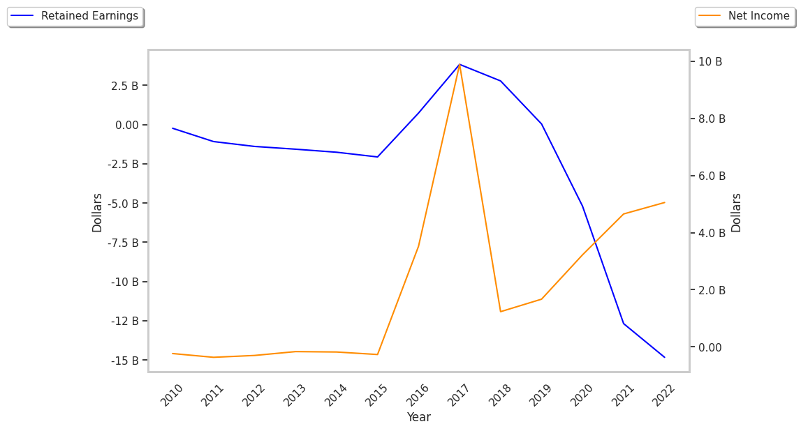 Charter Communications had poor record of retained earnings with an average of $-3494692307.6923075. Retained earnings are the sum of the current and previous reporting periods' net asset amounts, minus all dividend payments. It's a similar metric to free cash flow, with the difference that retained earnings are accounted for on an accrual basis.
